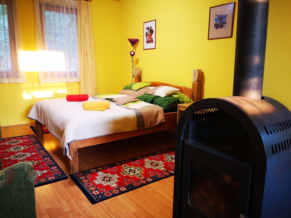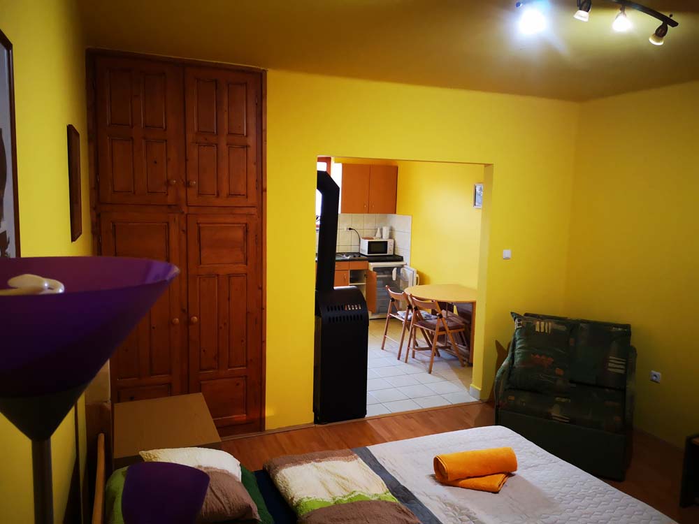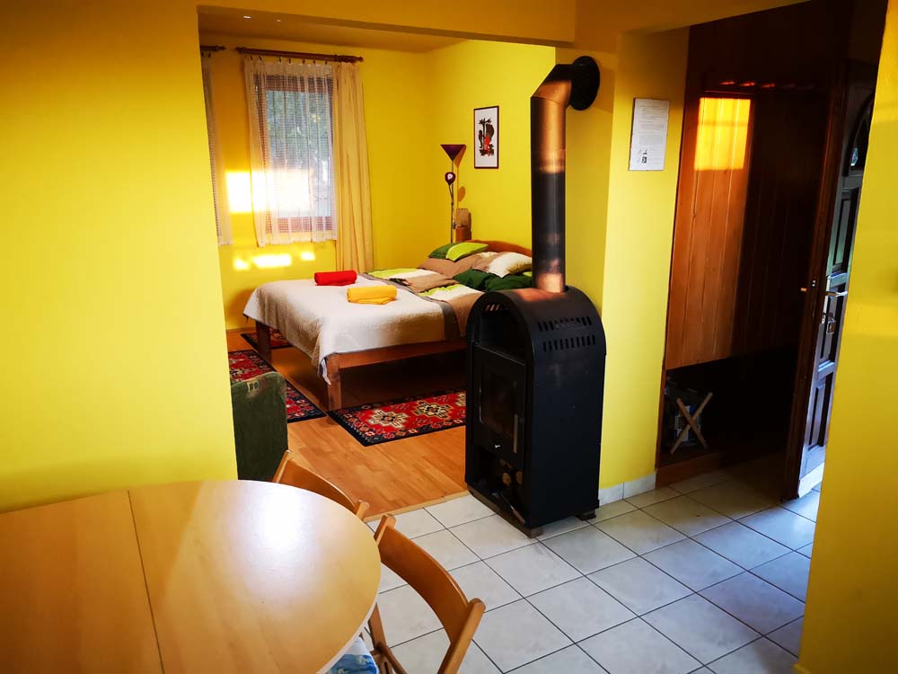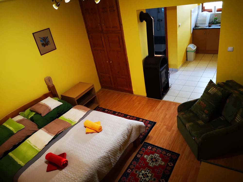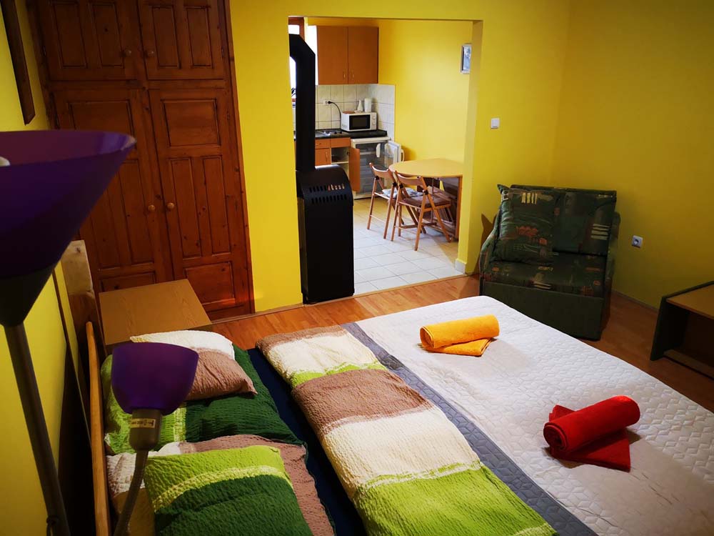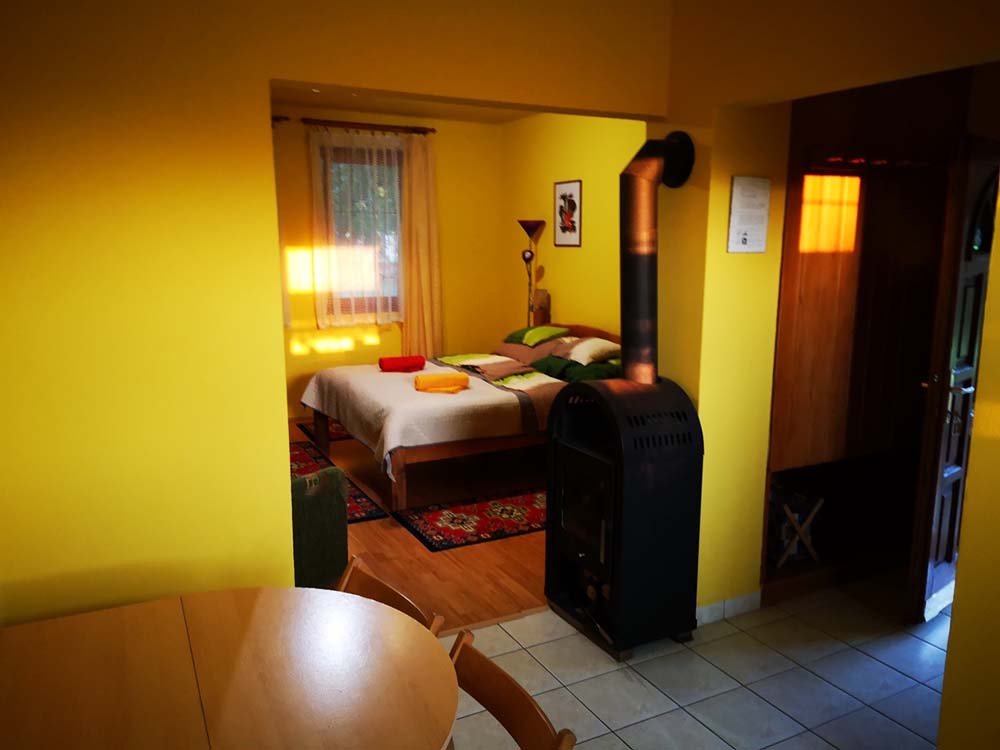 2 fős apartmanunk a hársfák árnyékában klimatizált hálószobával, felszerelt konyhával, zuhanyzós fürdőszobával, kandallóval és terasszal nyújt kényelmet vendégeink számára.