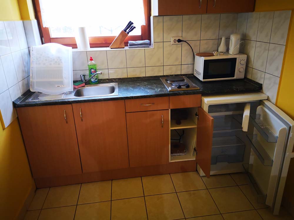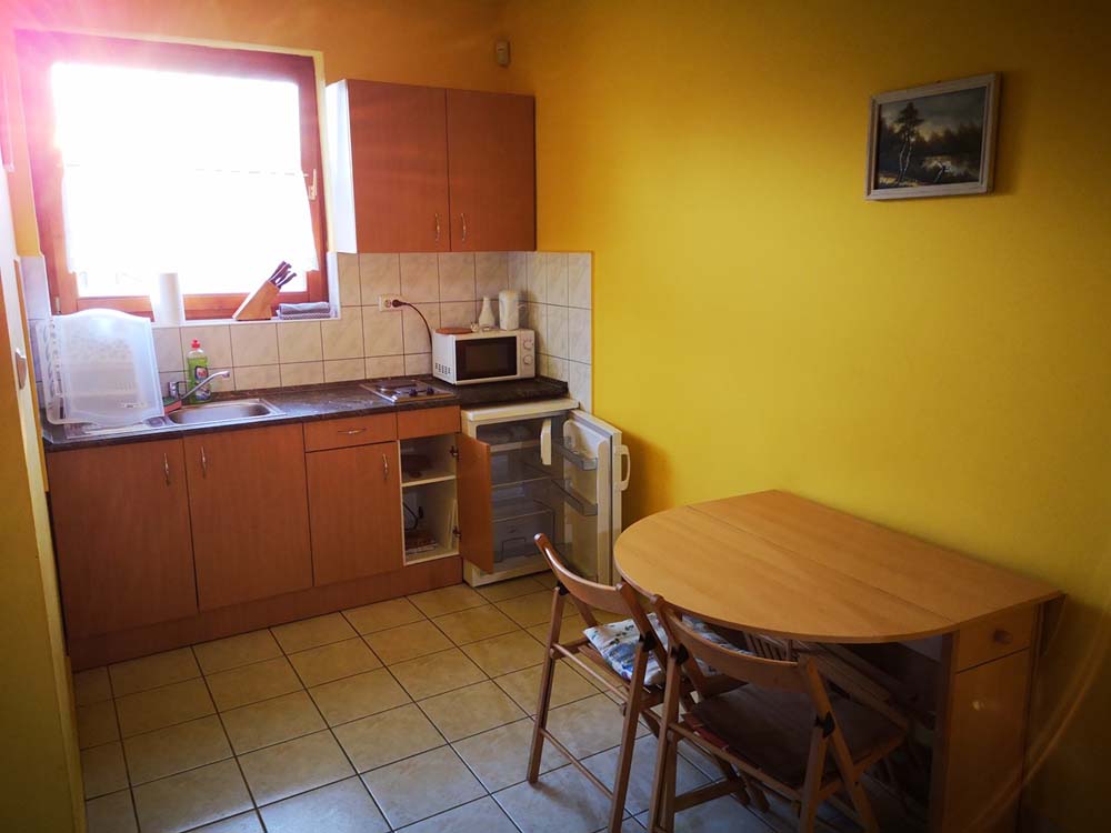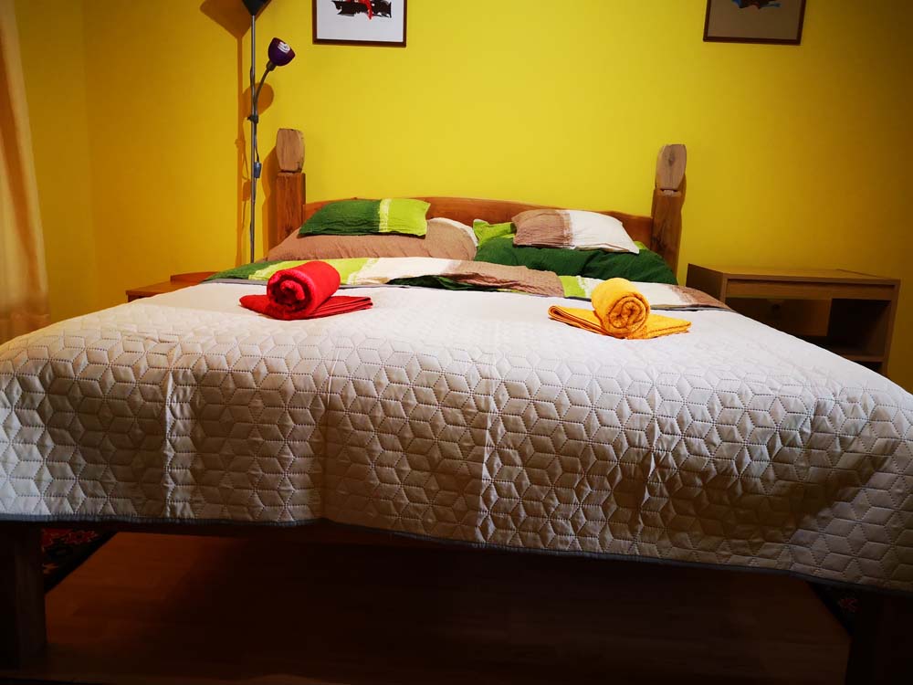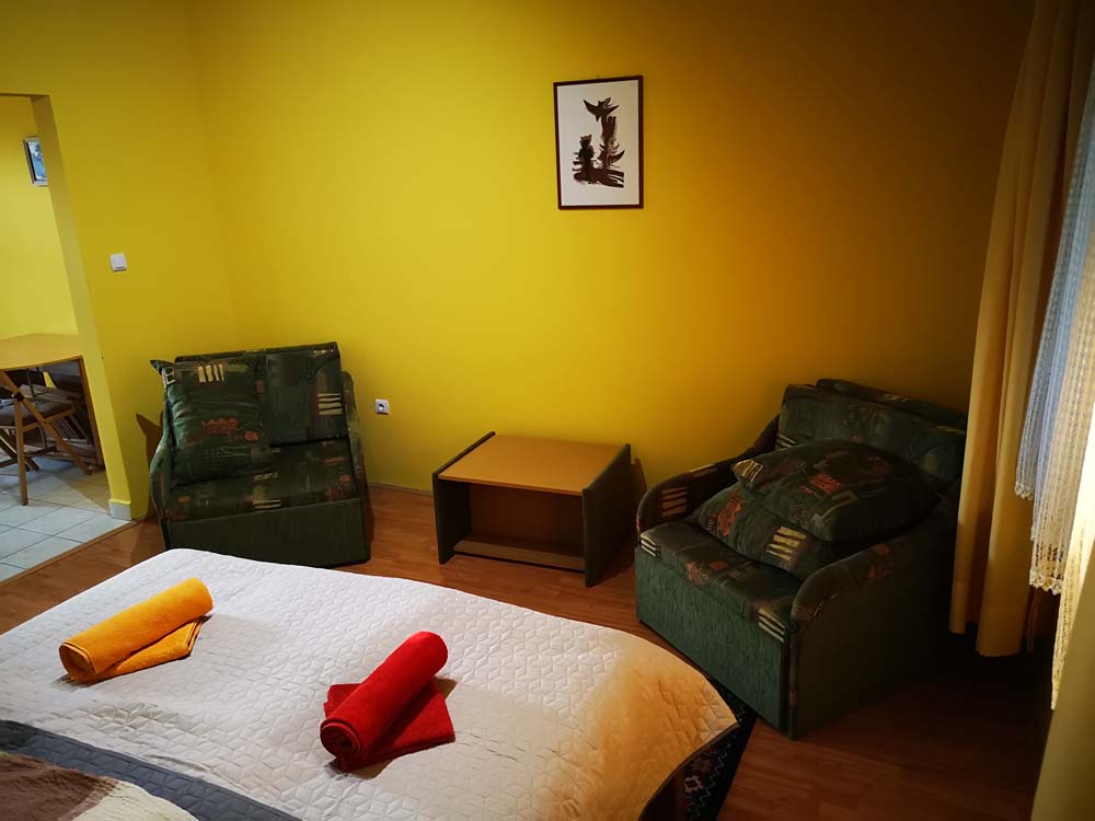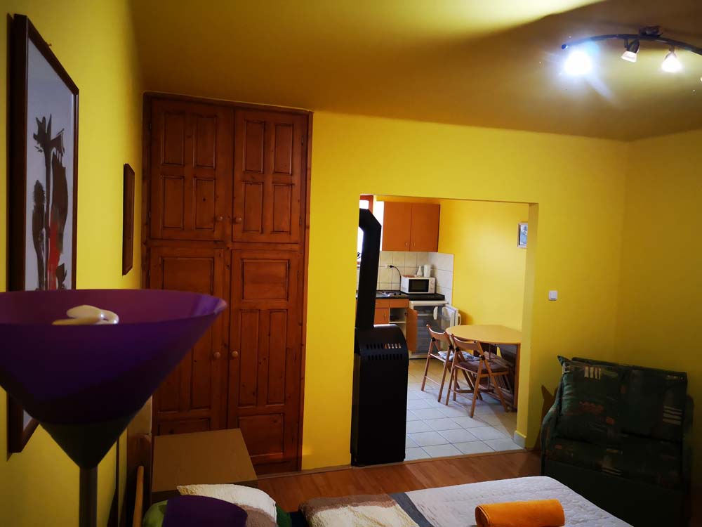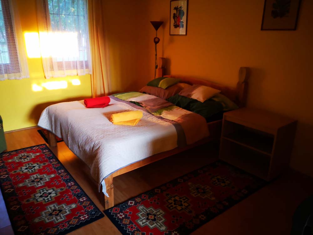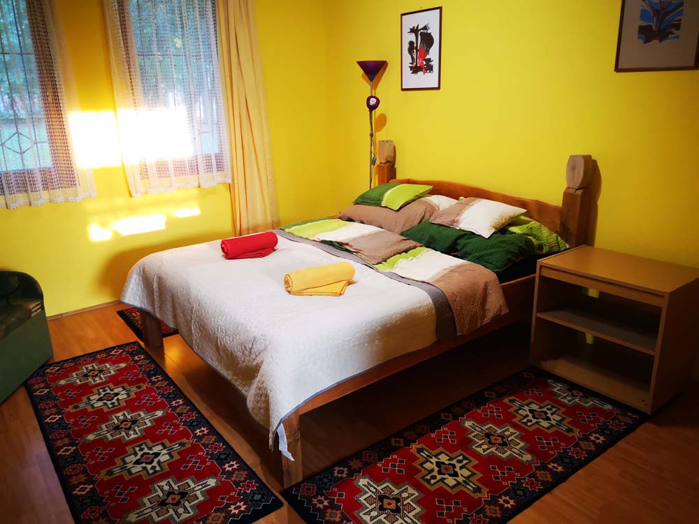 2 fős apartmanunk a hársfák árnyékában klimatizált hálószobával, felszerelt konyhával, zuhanyzós fürdőszobával, kandallóval és terasszal nyújt kényelmet vendégeink számára.